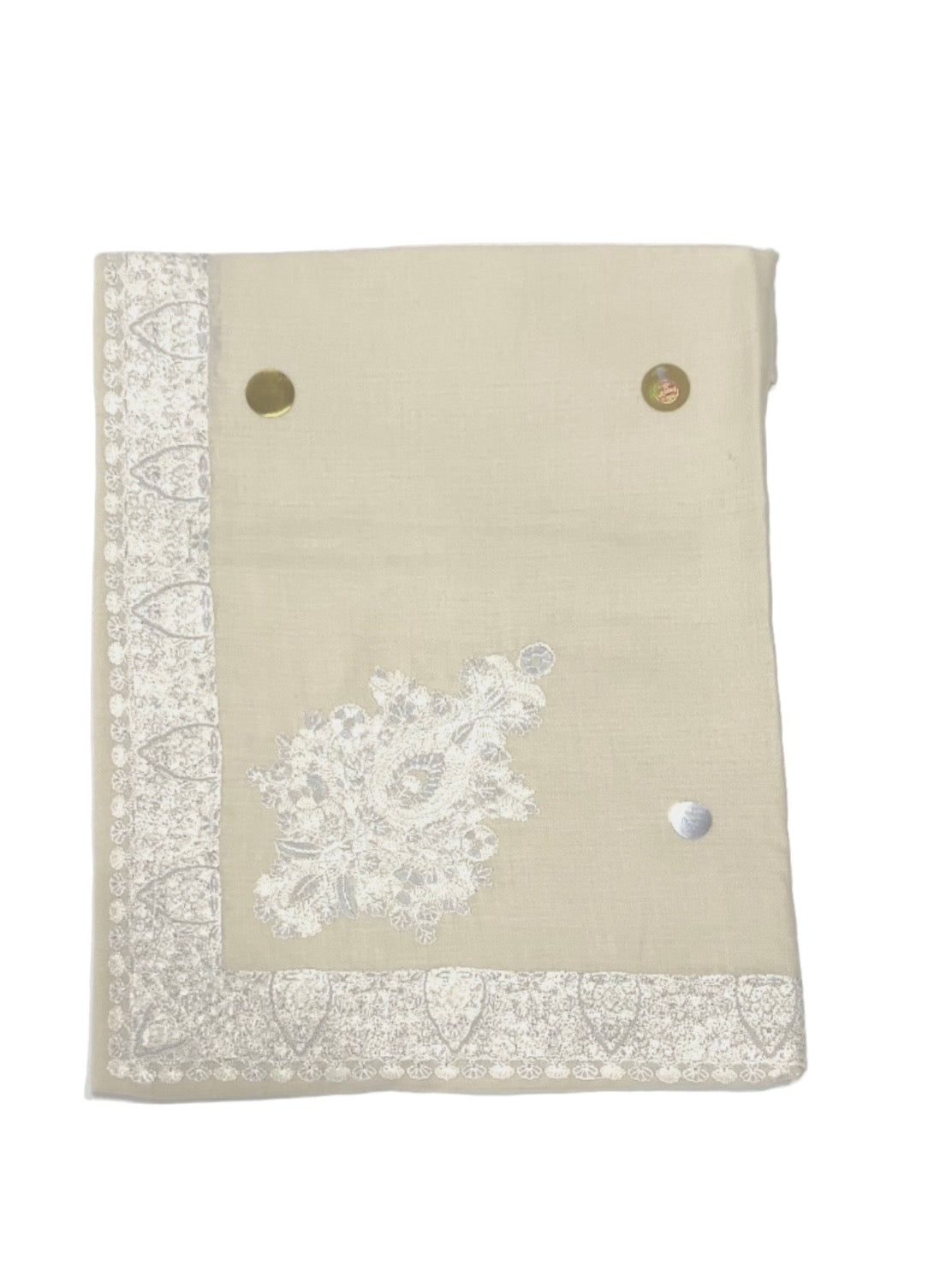 شال كشميري ترمة كاملة، مصنوع من الصوف، بنقشات جديدة وحصرية بطابع عصري. يتميّز بألوان هادئة؛ لون الشال بيج، ومطرز بنقشة بخيوط بدرجات البيج والرمادي الفاتح والأبيض